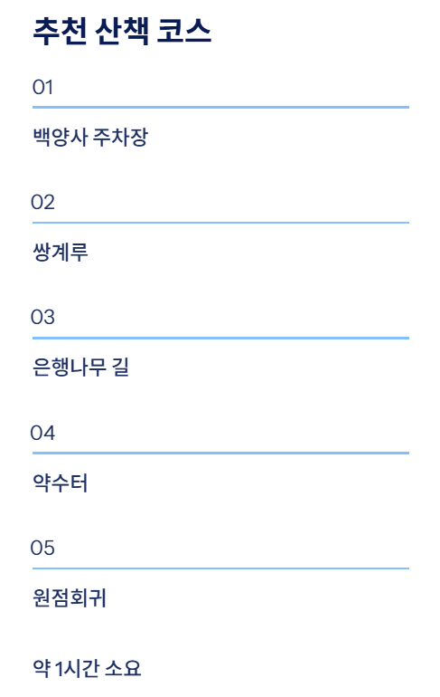 백양사 주차장 → 쌍계루 → 은행나무 길 → 약수터 → 원점회귀 (약 1시간 소요)