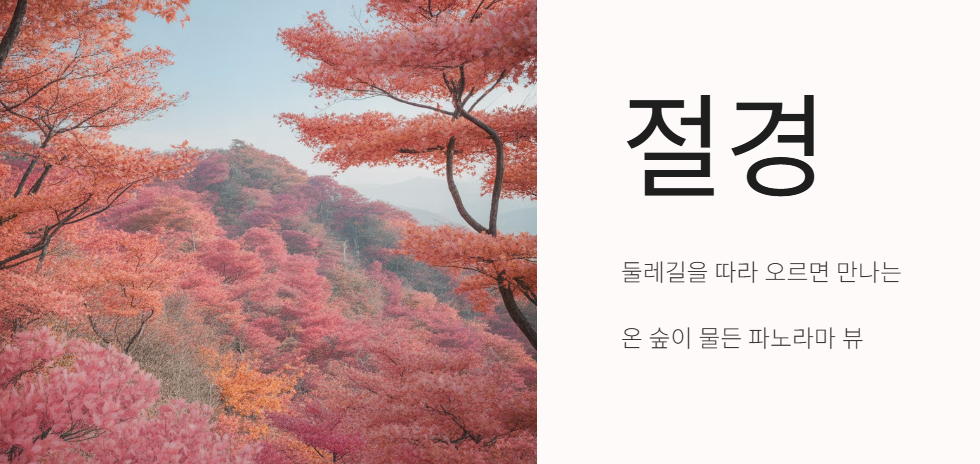 - 단풍 절정기는 보통 10월 중순 ~ 11월 초 사이이며, “단풍이 들기 시작한 ~ 절정에 이를 것으로 보입니다.”라는 기록이 있습니다.