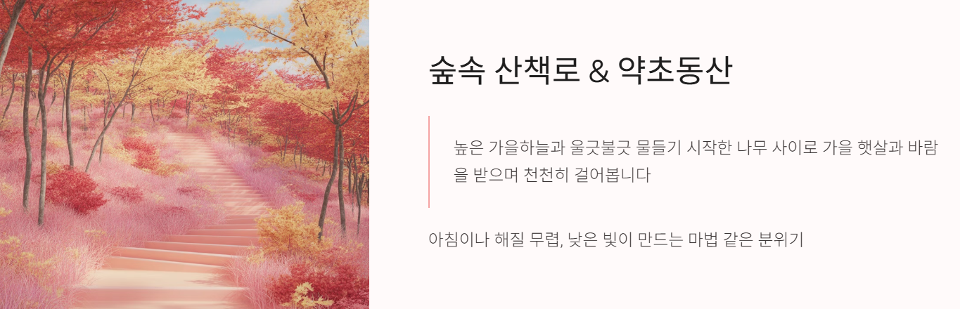 입구에서부터 약초동산 쪽으로 이어지는 완만한 숲길이 가을엔 노란·붉은빛으로 물들어 걷기 좋습니다. 이곳은 단풍이 시작될 때부터 색감이 풍부해 사진 찍기에도 예쁜 장소예요. 특히 “높은 가을하늘과 울긋불긋 물들기 시작한 나무사이로 가을 햇살과 바람을 받으며 숲 길 따라 천천히 걸어봅니다” 라는 후기가 있습니다.