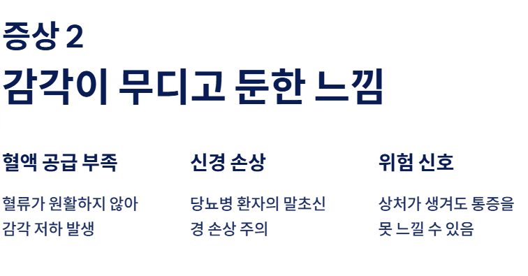 당뇨병 환자의 경우 말초신경 손상으로 인해 감각이 점차 떨어지고, 심하면 상처가 생겨도 통증을 느끼지 못하는 위험한 상황으로 이어질 수 있습니다.