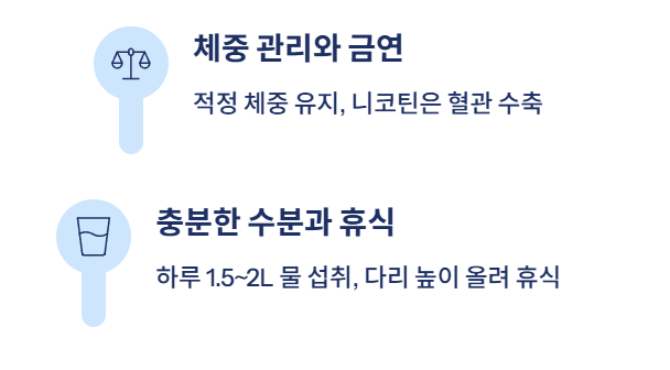 하루 1.5~2리터의 물을 꾸준히 마시고, 다리를 높게 올려 휴식하는 습관을 가지세요.