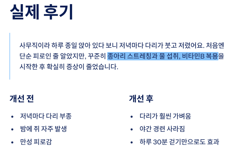 저는 사무직이라 하루 종일 앉아 있다 보니 저녁마다 다리가 붓고 저렸어요. 처음엔 단순 피로인 줄 알았지만, 꾸준히 종아리 스트레칭과 물 섭취, 비타민B 복용을 시작한 후 확실히 증상이 줄었습니다. 지금은 하루 30분 걷기만으로도 다리가 훨씬 가볍고, 밤에 쥐 나는 일도 사라졌어요.