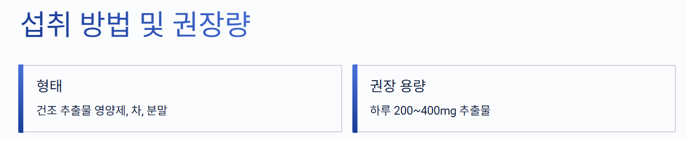 일반적으로 하루 200~400mg 정도의 추출물을 꾸준히 복용하는 것이 권장됩니다.