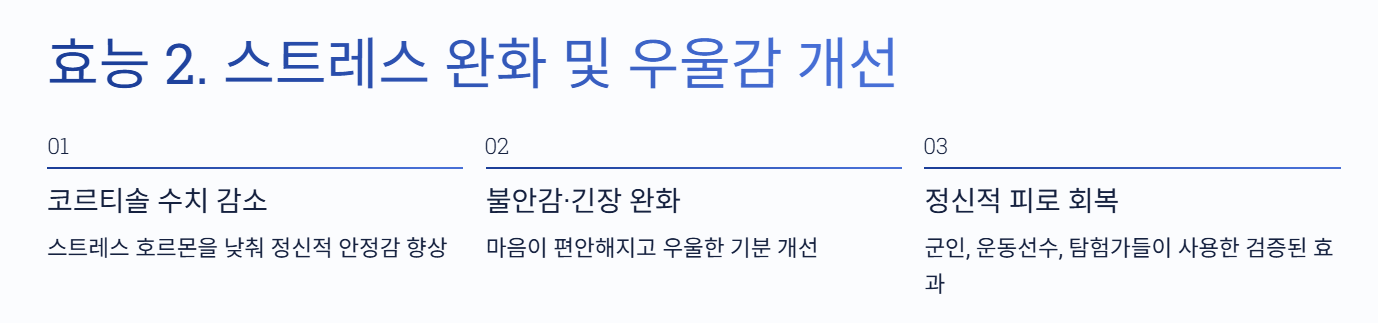 이로 인해 불안감이나 긴장감, 우울한 기분이 완화되고, 마음이 편안해지는 효과를 느낄 수 있습니다.