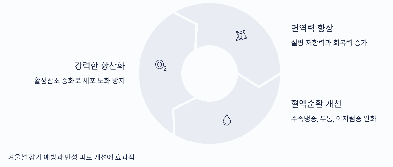또한 혈액순환 개선에도 도움을 주어 손발이 찬 사람이나 두통, 어지럼증이 잦은 사람에게도 좋은 보조 효과를 기대할 수 있습니다.