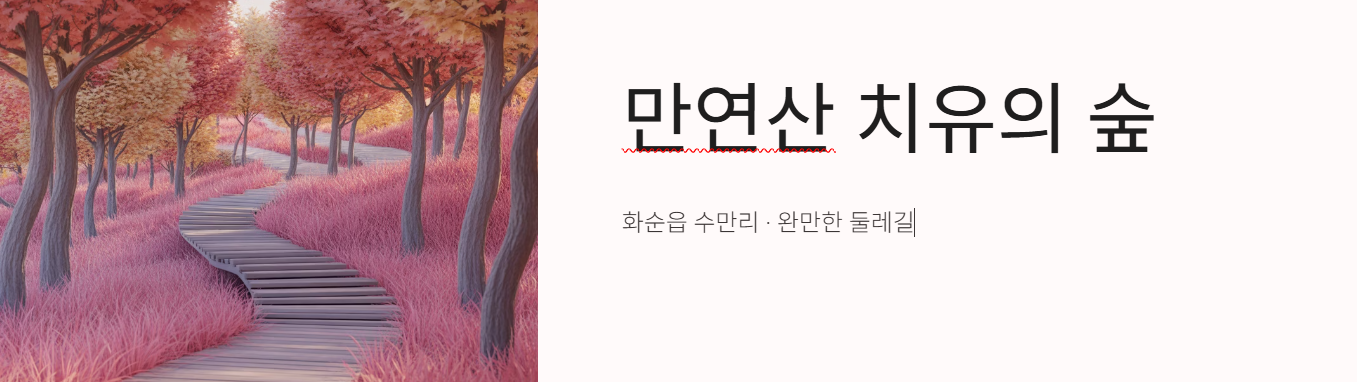 화순의 또 다른 명소는 만연산 치유의 숲입니다. 이곳은 완만한 산세 덕분에 누구나 부담 없이 오를 수 있고, 곳곳에 산림욕장과 쉼터가 잘 조성되어 있습니다. 가을이 되면 산 전체가 빨강, 주황, 노랑으로 물들며 말 그대로 ‘치유의 길’이 됩니다. 단풍이 유난히 짙고 선명한 색을 띠어 사진 촬영 명소로도 유명하죠.