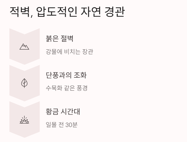 붉은빛 바위 절벽이 강물에 비치는 풍경이 장관을 이루며, 가을에는 주변 산의 단풍이 절벽과 어우러져 한 폭의 수묵화처럼 보입니다. ‘적벽’이라는 이름답게 단풍철이면 붉은 바위와 붉은 잎이 어우러져 더욱 깊은 색감을 자랑하죠.