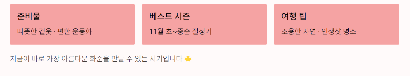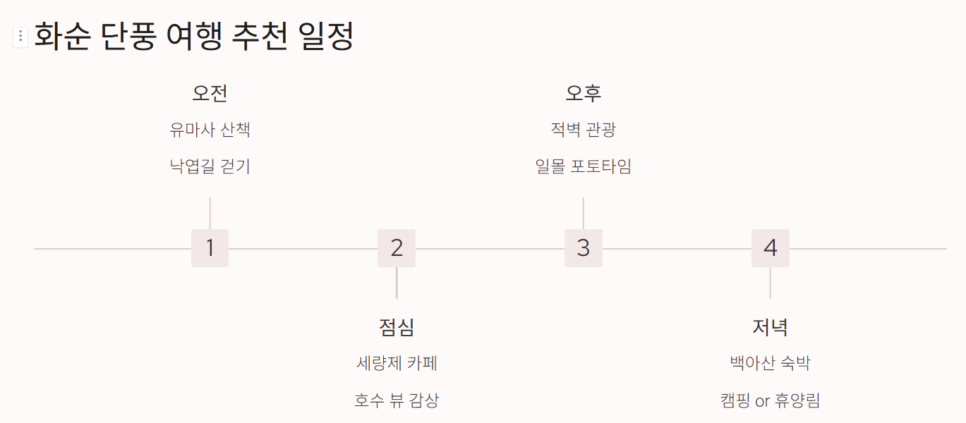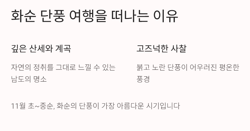 가을의 화순은 관광객이 북적이지 않아 조용히 자연을 즐길 수 있고, 어디서든 인생샷을 남기기 좋습니다. 따뜻한 겉옷과 편한 운동화를 챙기고, 부드러운 햇살 아래에서 남도의 단풍 여행을 만끽해보세요. 단풍의 절정은 매년 11월 초~중순, 지금이 바로 가장 아름다운 시기입니다.