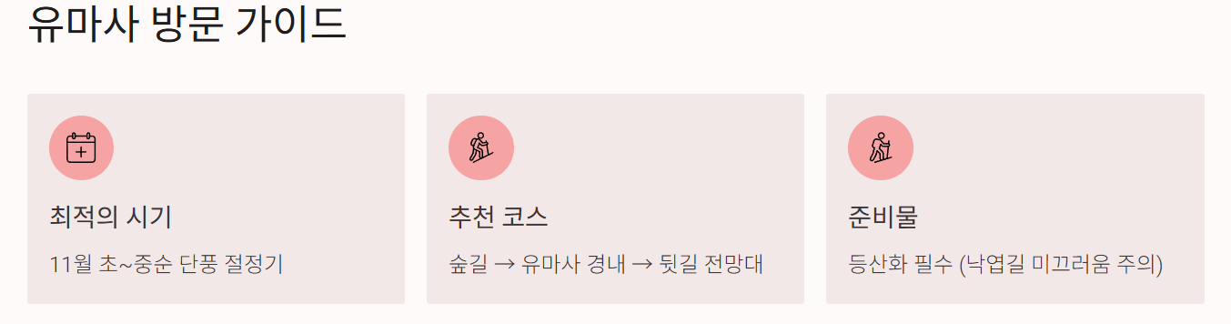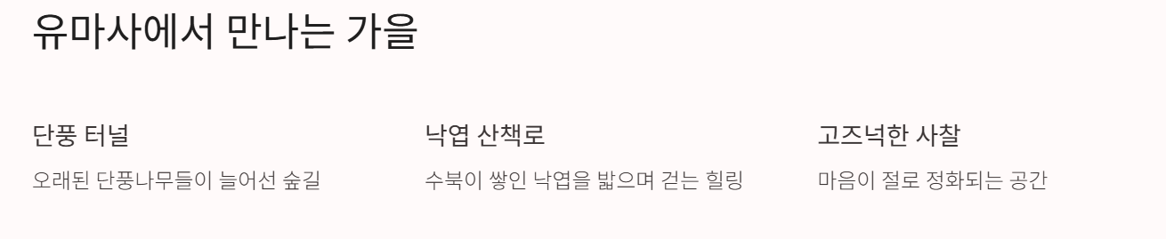 - 추천 코스: 주차장에서 일주문까지 이어지는 숲길 → 유마사 경내 → 뒷길 전망대