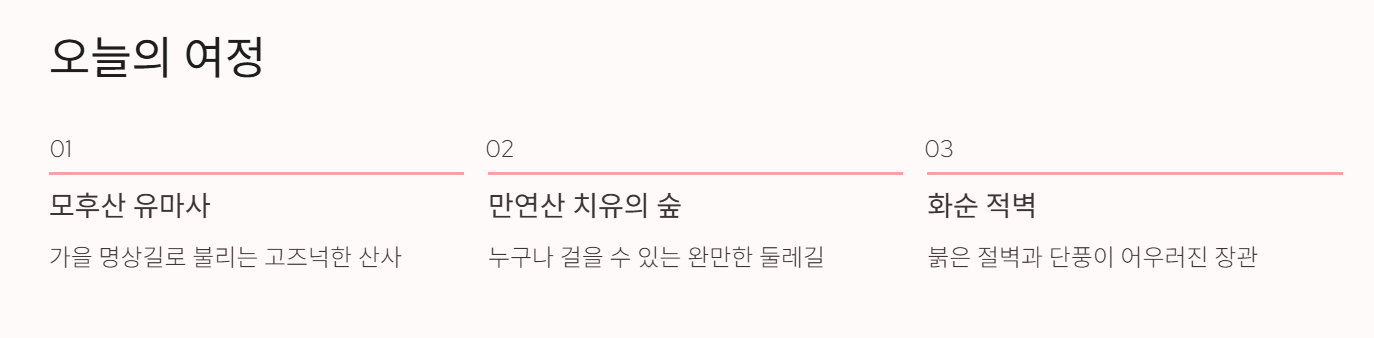 가을철 화순에서 단풍이 가장 아름다운 3곳의 스팟(모후산 유마사, 만연산 치유의 숲, 화순 적벽)을 중심으로 소개하고, 실제 방문 후기와 인근 추천 코스까지 알려드릴께요