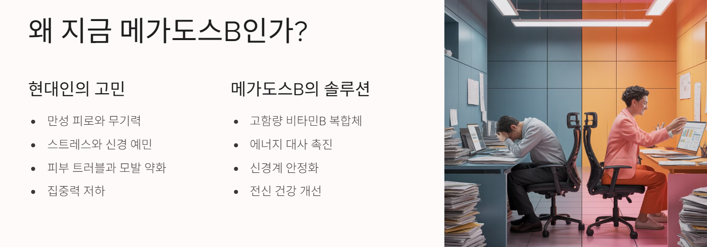 하루의 에너지를 되찾고 싶다면, 메가도스B 한 알로 비타민B군을 보충해보세요.