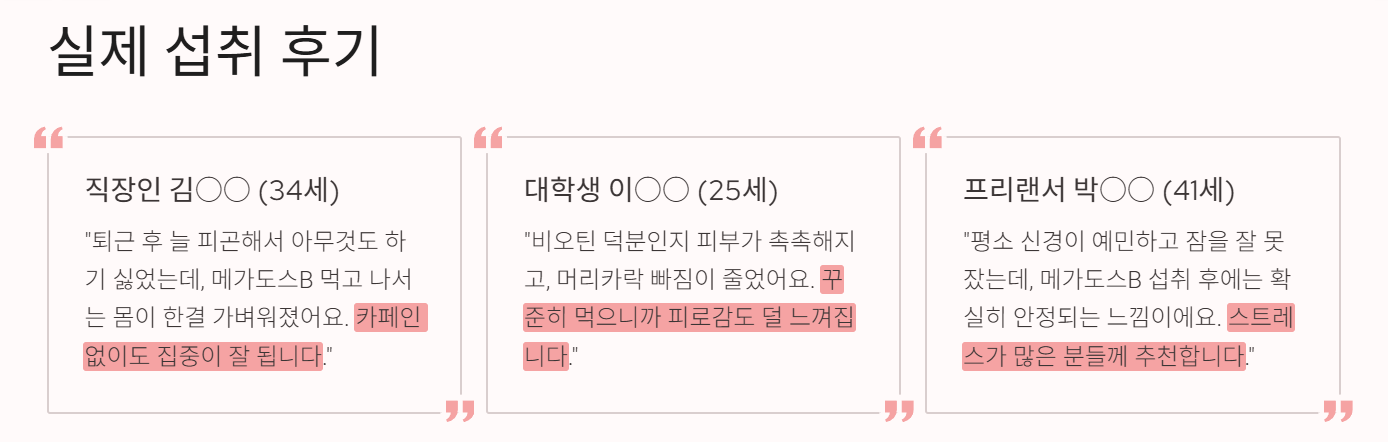 “퇴근 후 늘 피곤해서 아무것도 하기 싫었는데, 메가도스B 먹고 나서는 몸이 한결 가벼워졌어요. 카페인 없이도 집중이 잘 됩니다.”