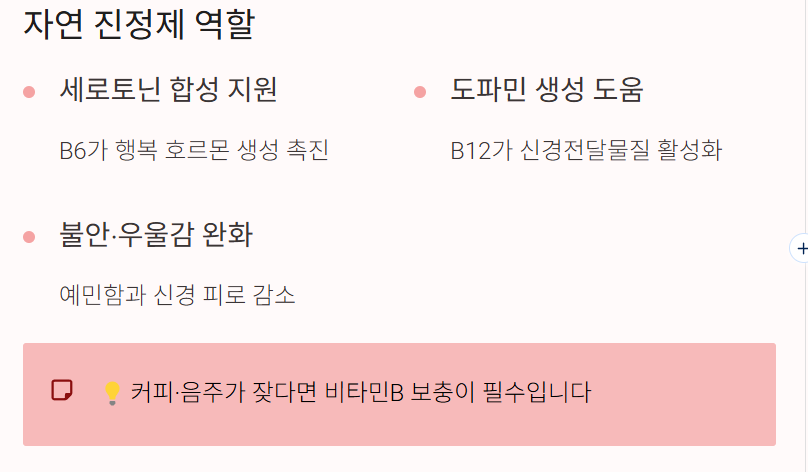 B6와 B12는 세로토닌, 도파민 같은 신경전달물질의 합성에 도움을 주어 불안, 우울감, 예민함을 완화합니다.