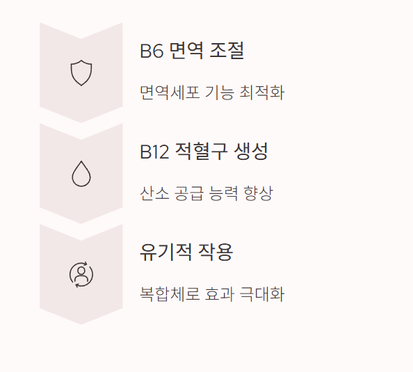 B6는 면역반응을 조절하고, B12는 적혈구 생성을 촉진해 산소 공급 능력을 높입니다.
