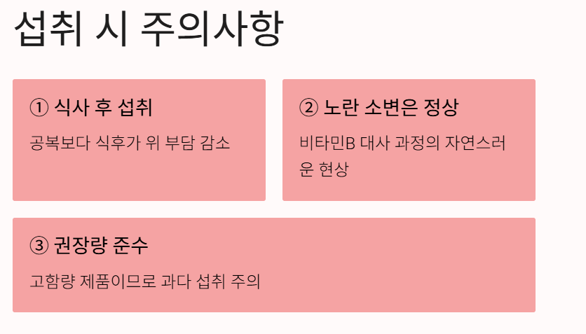 - 비타민B 특유의 노란 소변 색은 정상적인 대사 과정이니 걱정하지 않아도 됩니다.
