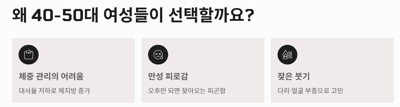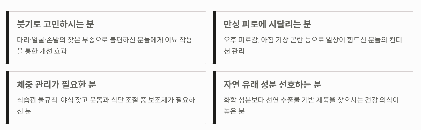 특히 다이어트를 위해 식단·운동 병행 중인 40대·50대 여성 사용자들에게 보조제로 많이 언급됩니다. - 부종 · 붓기 완화 및 순환 개선