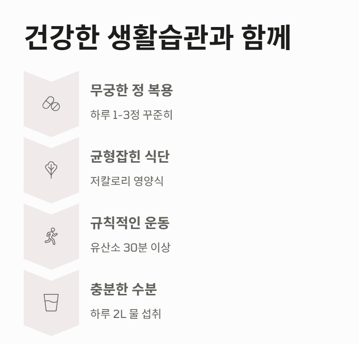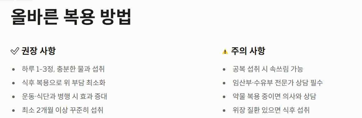 - 운동, 식단, 생활습관 개선 없이는 보조제로서의 역할만 하므로 전체적인 건강관리 루틴 내에서 활용하는 것이 바람직합니다.