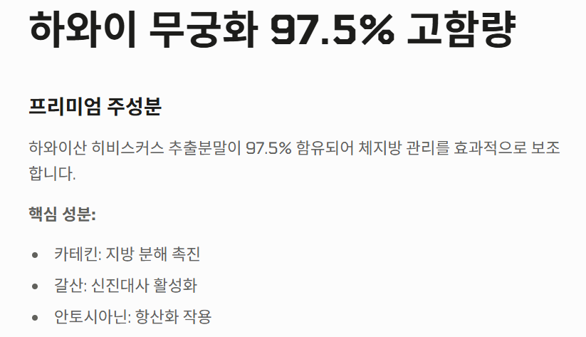 이 제품은 하와이 무궁화 추출분말이 97.5% 함유되어 있다는 설명이 나와 있습니다.