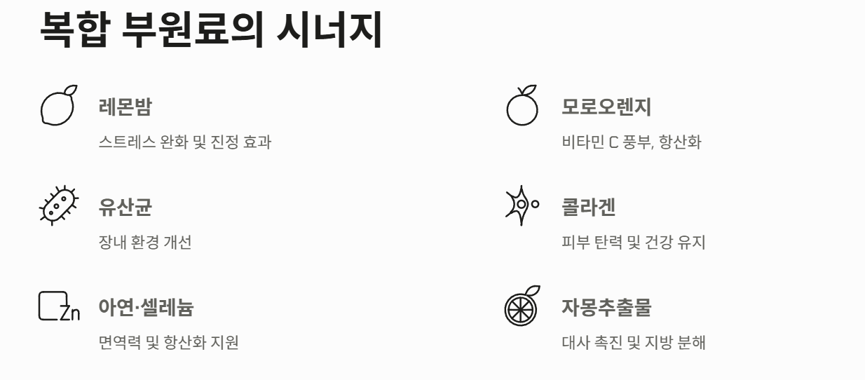 또한, 부원료로 레몬밤, 모로오렌지, 자몽추출물, 콜라겐, 유산균, 비타민 C, 아연, 셀레늄 등이 포함되어 있어 다방면으로 보조 역할을 한다는 설명이 존재합니다.