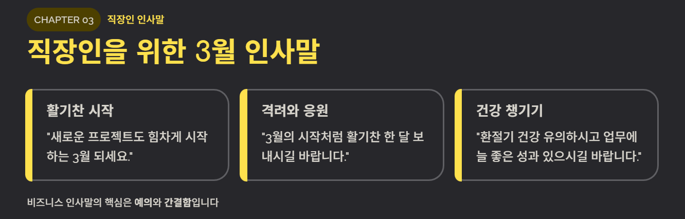 비즈니스용 3월 인사말은 예의와 간결함이 핵심입니다.