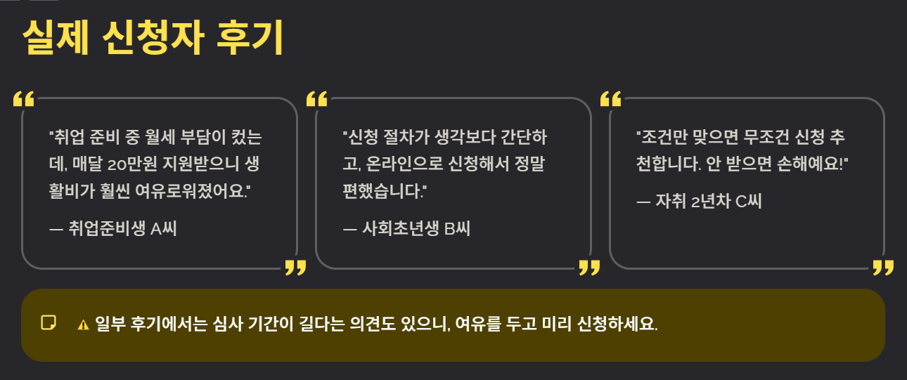 “취업 준비 중이라 월세 부담이 컸는데 매달 20만원 지원받으니 생활비가 훨씬 여유로워졌어요.”
