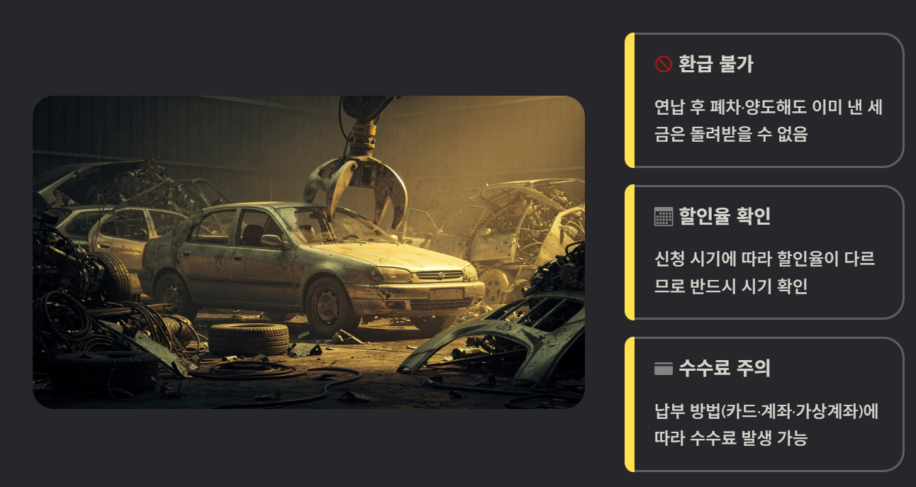 - 환급 불가: 연납 후 차량을 폐차하거나 양도하더라도 이미 납부한 세금은 환급되지 않습니다.