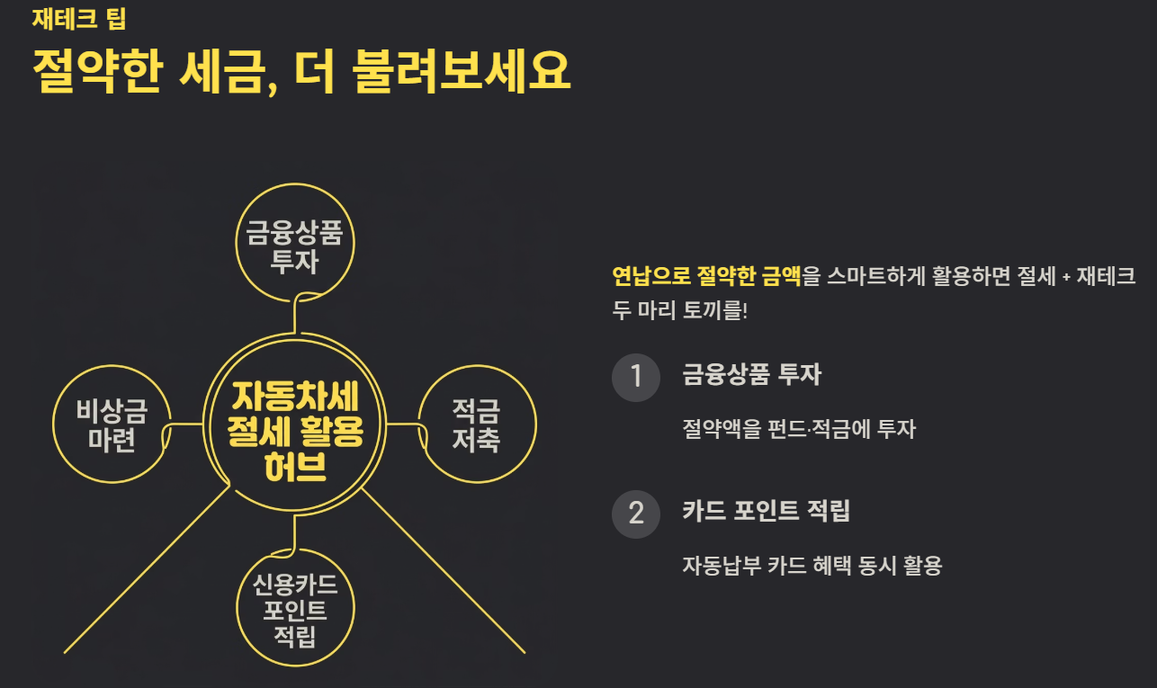 자동차세 연납으로 절약한 금액을 다른 금융상품에 투자하거나 저축하면, 연간 금융수익과 세금 할인 효과를 동시에 누릴 수 있습니다. 특히 신용카드 자동납부 혜택과 연계하면 포인트 적립까지 가능합니다.