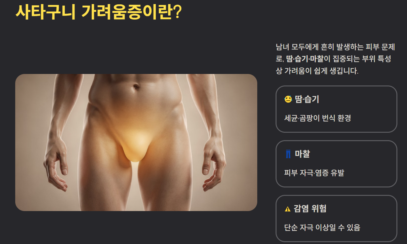 사타구니 가려움증은 남녀 모두에게 흔하게 발생하는 피부 문제로, 일상생활에 큰 불편을 주는 증상입니다. 특히 땀, 습기, 마찰이 많은 부위이기 때문에 가려움증이 쉽게 발생하며, 때로는 단순한 피부 자극을 넘어 곰팡이 감염이나 피부 질환과 관련될 수 있어 주의가 필요합니다. 이번 글에서는 사타구니 가려움증의 원인, 증상, 관리 방법과 예방책을 상세히 알아보고, 실제 경험자 후기도 소개하겠습니다.