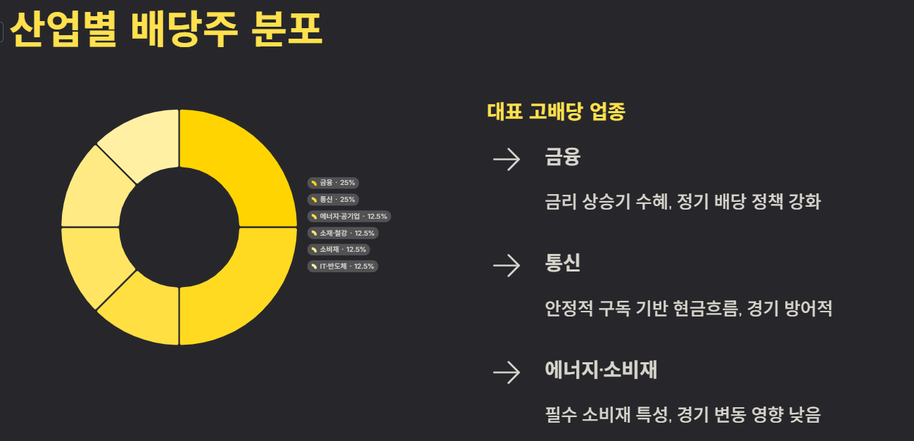 배당주란 기업이 벌어들인 이익의 일부를 주주에게 현금 또는 주식 형태로 나눠주는 종목을 의미합니다. 특히 배당수익률이 높은 기업은 안정적인 수익을 기대할 수 있어 장기 투자자에게 적합합니다.
