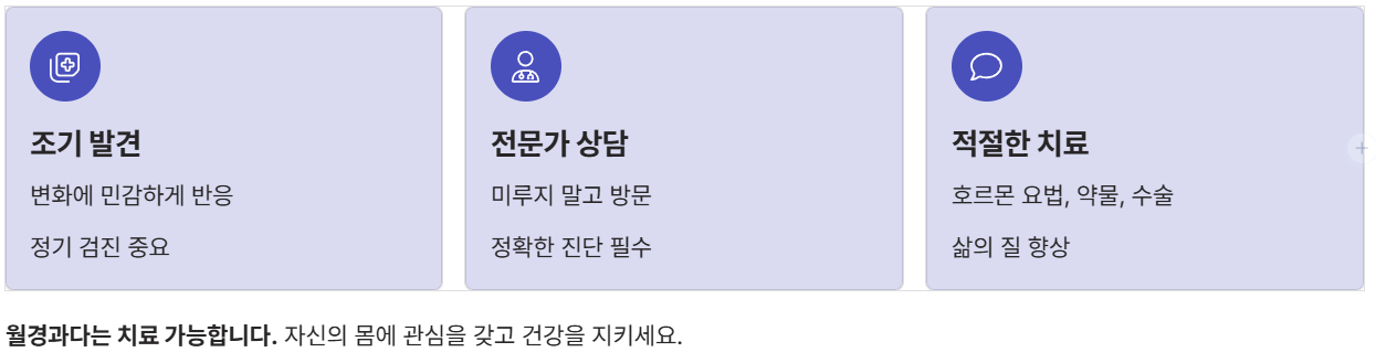 - 증상 특징: 특히 폐경 전후 여성에게서 월경과다가 나타난다면 반드시 암 검진을 받아야 합니다.