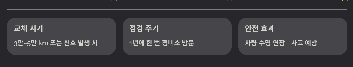 많은 운전자들이 “언제 교체해야 할까?”라는 고민을 하는데, 정확한 교체주기를 알고 관리하면 차량의 수명을 늘리고 안전한 주행을 유지할 수 있습니다.